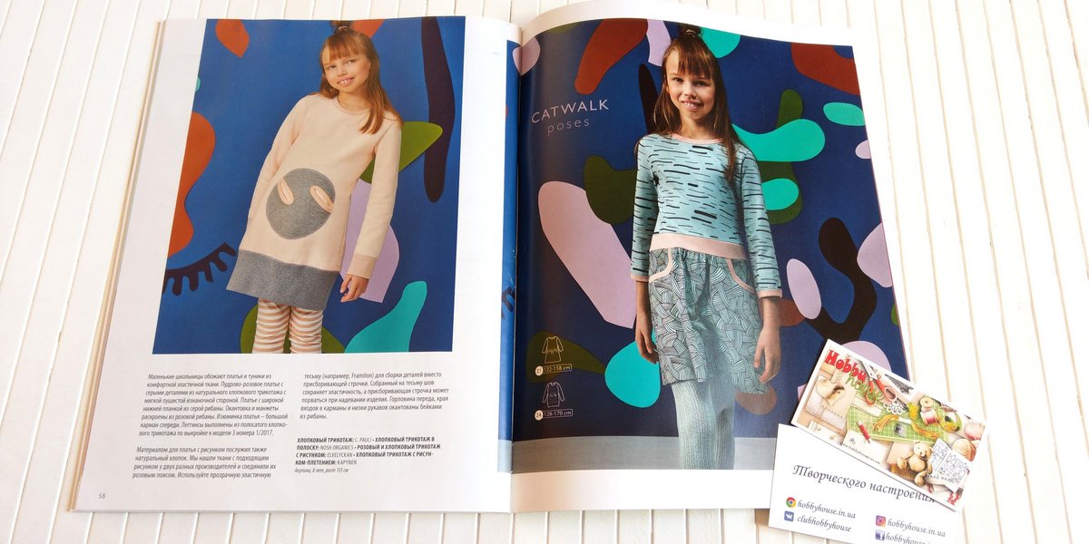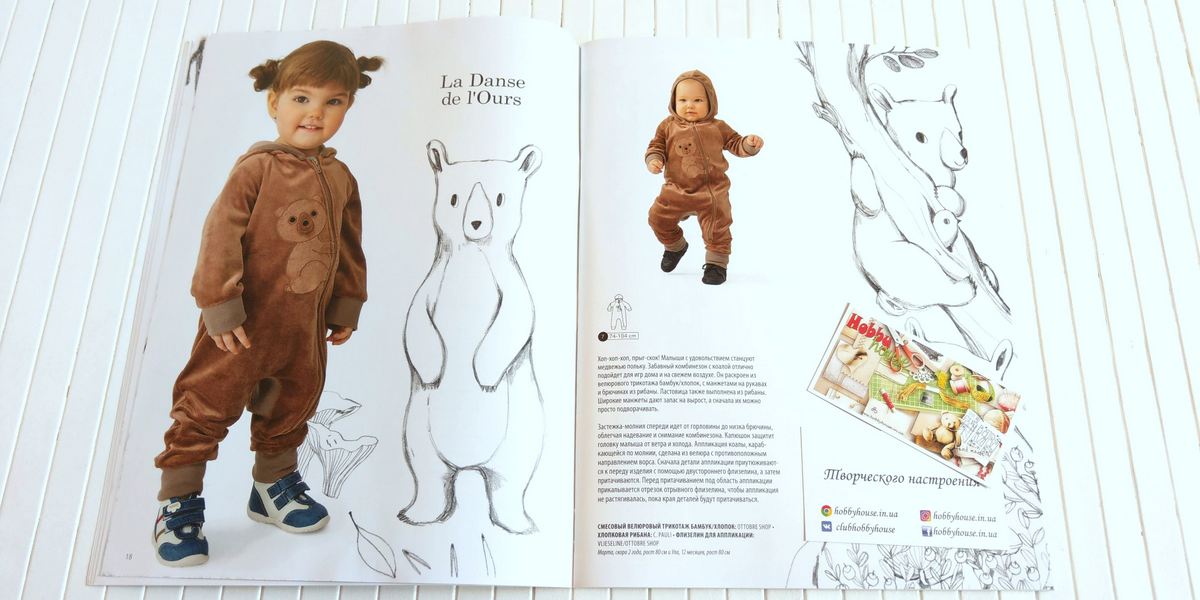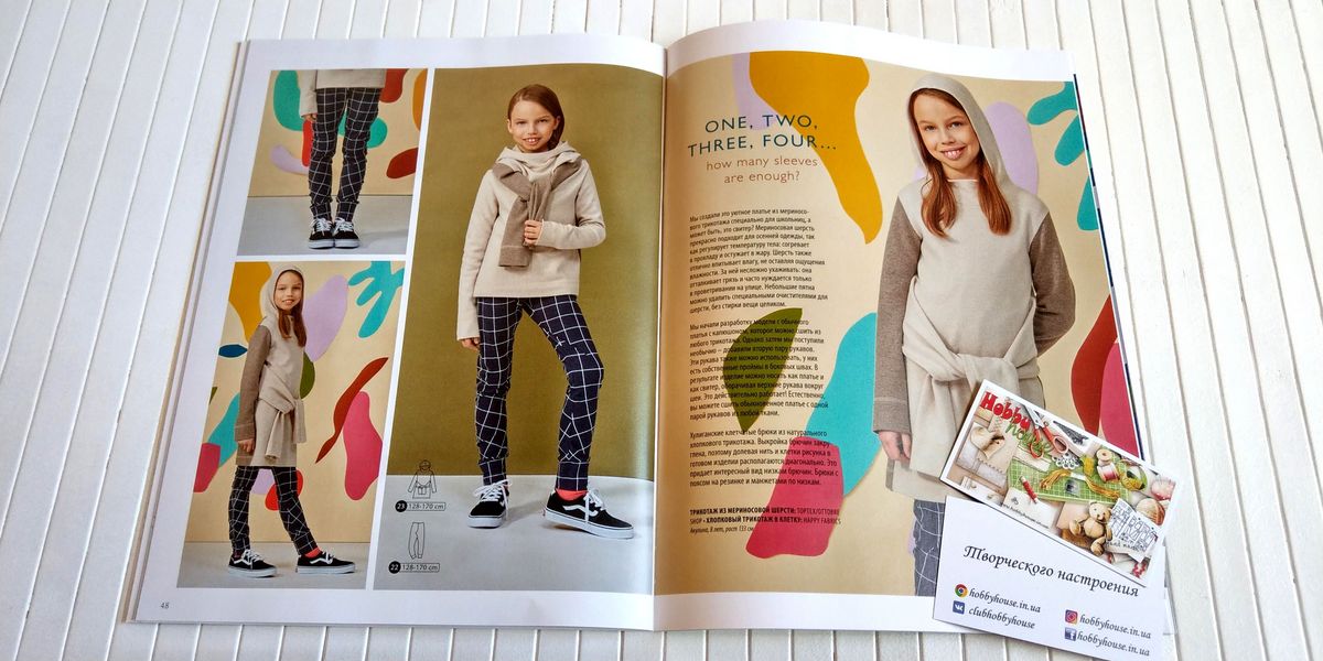 Два платья-сарафана, трикотажная водолазка, блузка в стиле Питера Пена, два трикотажных платья, жаккардовое пальто с капюшоном и интересное джинсовое платье из старых вещей. Шерстяная куртка с капюшоном, практичные брюки для прогулок и футболка-реглан.