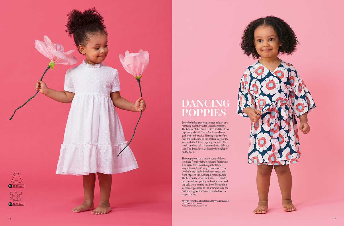Одяг для святкування розкішного квітучого літа: три гарні сукні, трикотажна туніка, штани з оборками, топ із запахом і багатоярусна спідниця. Джинсова спідниця, топ з віскози, футболка і спортивні шорти. Розміри 86–116 см, 92/98–128/146 см, 110–146 см, 116–152 см