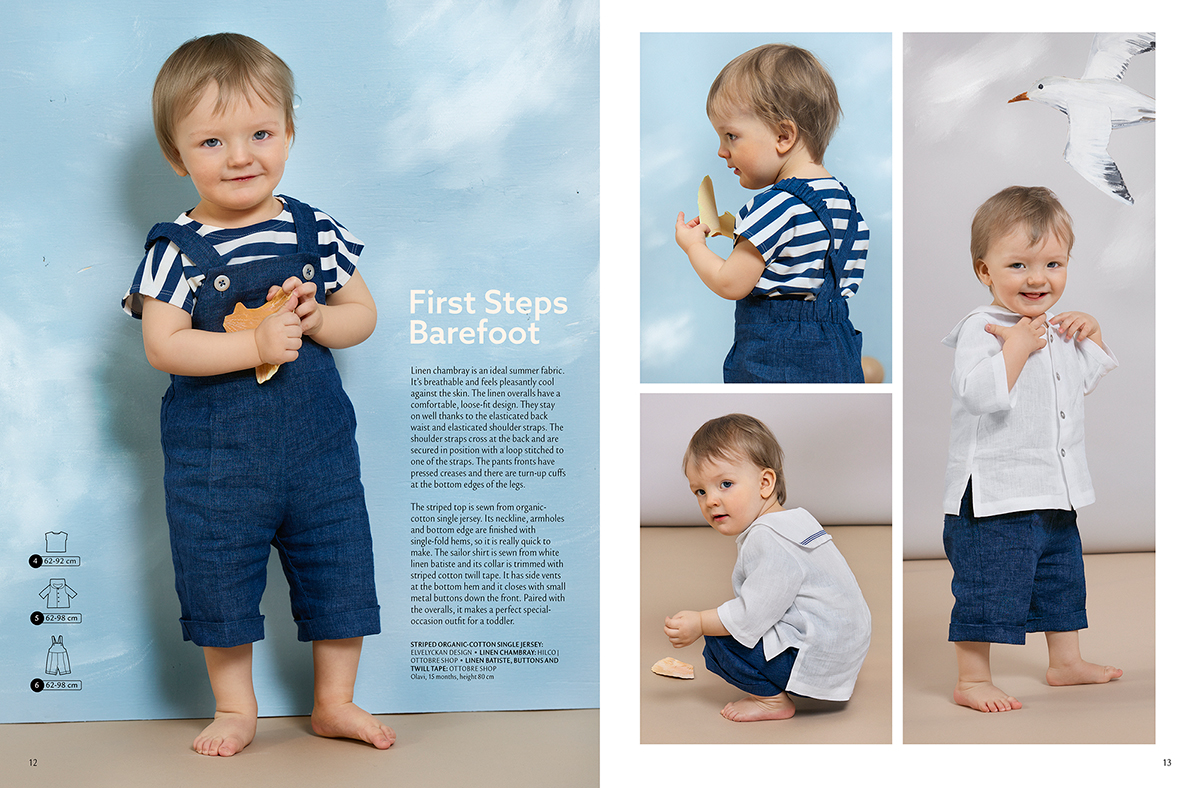 БАГАТО ВЕСЕЛЕЙ. Легке вбрання для юних відпочиваючих. Сорочка з попліну і бермуди. Смугасті штани-моряки, сукня-моряк, футболка та трикотажний топ на шнурівці. Джинсові шорти та бавовняний топ у швейцарську крапку. Дві сукні з органічного бавовняного трикотажу. Трикотажний топ без рукавів, матроска та лляний комбінезон. Розміри 62–92/98 см і 92/98–122/128/146 см