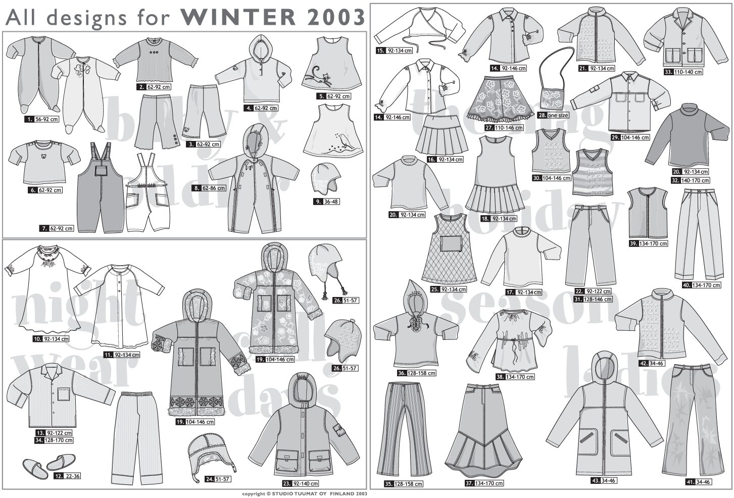 Міцний стьобаний верхній одяг, пальта зі штучної замші/хутра та теплі аксесуари забезпечують захист від зимових штормів. Розміри 62-170 см та 34-46